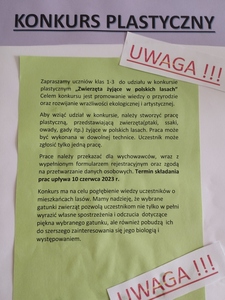 Zapraszamy uczniów klas I-III do udziału w konkursie plastycznym pt. "Zwierzęta żyjące w polskich lasach". Konkurs organizowany jest z inicjatywy Rady Rodziców. Celem konkursu jest promowowanie wiedzy o przyrodzie i rozwijanie wrażliwości ekologicznej i artystycznej. Regulamin konkursu: Aby...