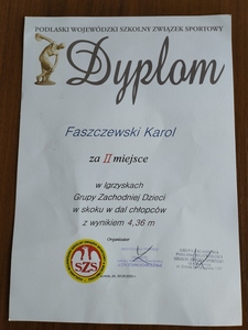 Mamy zaszczyt poinformować, iż uczeń klasy VI naszej szkoły - Karol Faszczewski - zajął II miejsce w półfinale Igrzysk Grupy Zachodniej Dzieci w skoku w dal chłopców organizowanych przez Podlaski Wojewódzki Szkolny Związek Sportowy. Karol uzyskał wysoki wynik 4,36 m. Serdecznie...