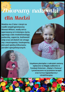 Nasza szkoła włączyła się w akcję zbierania nakrętek dla Madzi. Jeśli ktoś chciałby pomóc tej dzielnej dziewczynce i jej rodzinie, prosimy o przynoszenie nakrętek do szkolnego serca przed szkołą. Uzyskane pieniądze z nakrętek zostaną wpłacone na Magdy subkonto i przeznaczone na...