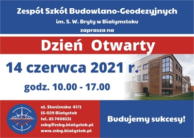 Dyrekcja Zespołu Szkół Budowlano-Geodezyjnych w Białymstoku serdecznie zaprasza ósmoklasistów i ich rodziców na Dzień Otwarty, który odbędzie się 14 czerwca br. w godz. 10.00 -17.00 W załączeniu zaproszenie i ulotka informacyjna