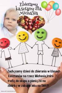 Szanowni Rodzice! Drodzy Uczniowie! Pomóżmy rodzicom małego Michałka w zgromadzeniu ogromnej kwoty na zakup leku na SMA poprzez zbiórkę kasztanów i żołędzi. Kasztany i żołędzie tafią do skupu, a pieniądze na zbiórkę leku. Akcja trwa od 15.10.2020 r. do 16.10.2020...