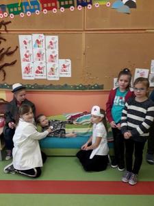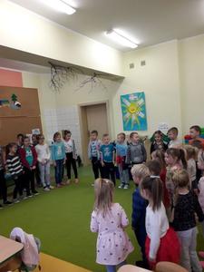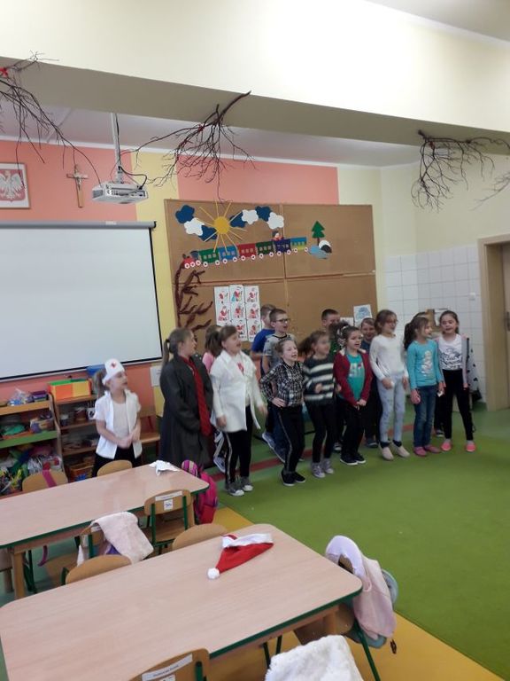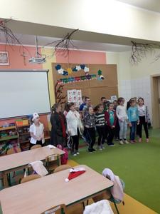 Klasa II przygotowała dla przedszkolaków inscenizację wiersza Jana Brzechwy pt. „Katar”. Po krótkiej pogadance uczniowie zaśpiewali także piosenkę pt.„Zatańczyły witaminy” nawiązującą do spożywania zdrowych posiłków, które wpływają na zwiększenie odporności organizmu człowieka.
