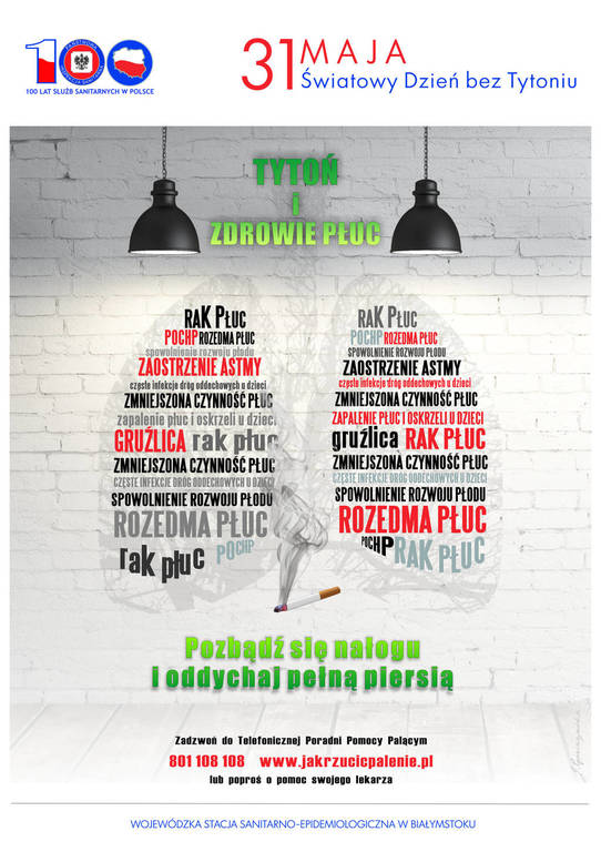 W dniu 31 maja 2019r. przypada ustanowiony przez WHO Światowy Dzień bez Tytoniu, którego hasło przewodnie w tym roku brzmi: „Tytoń i zdrowie płuc”. Celem tej inicjatywy jest zwrócenie uwagi na rolę płuc w organizmie człowieka oraz podniesienie świadomości społeczeństwa na temat zdrowotnych skutków używania tytoniu i narażenia na dym tytoniowy „z drugiej ręki”, szczególnie w kontekście funkcjonowania układu oddechowego.