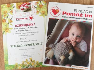 Ponadto, wspieraliśmy Fundację Pomóż Im, biorąc udział w konkursie „Słoik Nadziei” na rzecz dzieci z chorobami nowotworowymi w ramach kampanii "Pola Nadziei". Podczas kiermaszu ciast zebrano kwotę: 875 zł oraz w ramach akcji „Pączek dla Hospicjum” została przekazana kwota 763 zł na konto fundacji.