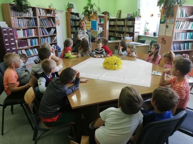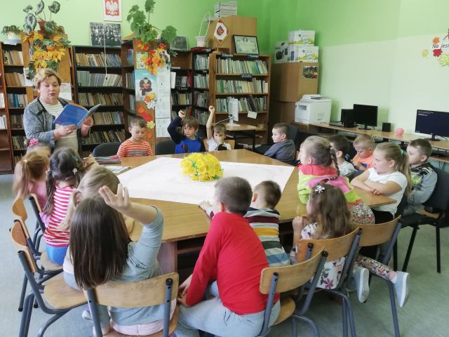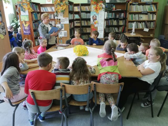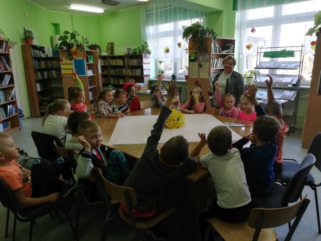Bibliotekarka zapoznała uczniów z regulaminem wypożyczania książek. Wytłumaczyła, ile czasu można przetrzymywać książkę oraz jak należy obchodzić się z książką, aby jej nie zniszczyć. W czasie lekcji dzieci rozmawiały również o czasach, kiedy nie było książek i na czym oraz czym kiedyś pisano.