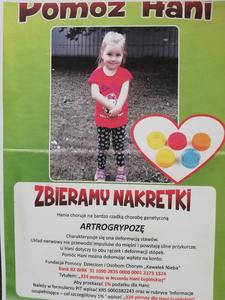 W naszej szkole do końca maja 2020 prowadzona jest zbiórka nakrętek dla dziewczynki chorej na artogrypozę. Jest to grupa objawów polegająca na występowaniu wrodzonych, wielostawowych przykurczy. Zwana też jest wrodzoną sztywnością stawów. U Hani dotyczy to obu rączek i deformacji stópek. Leczenie jest objawowe, uzależnione od przyczyny wywołującej. Najważniejszą jednak jego częścią jest rehabilitacja.