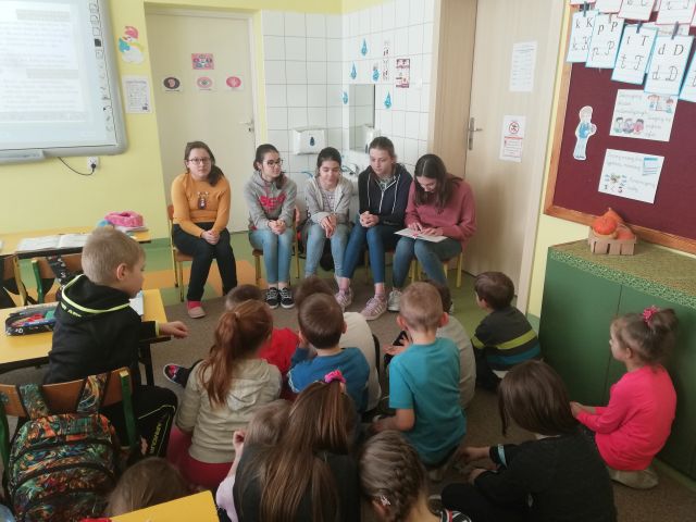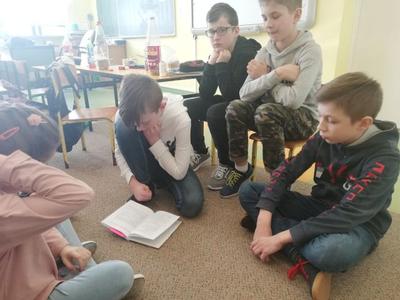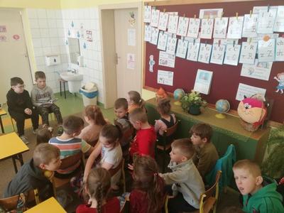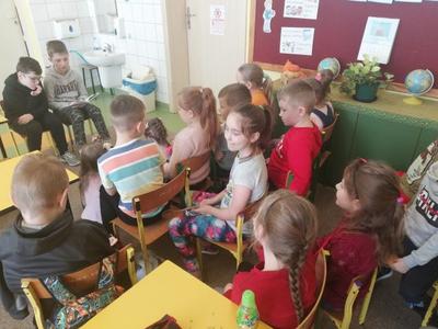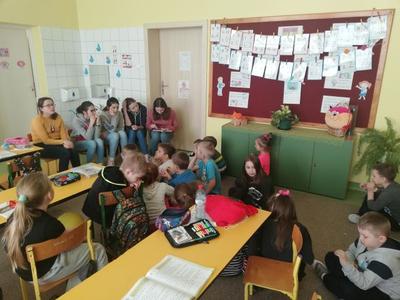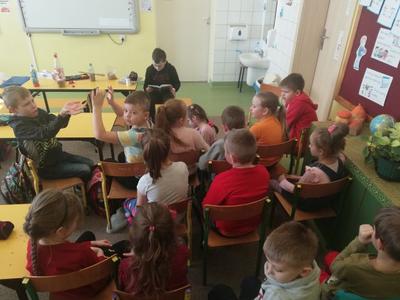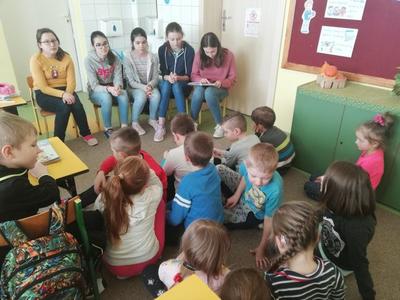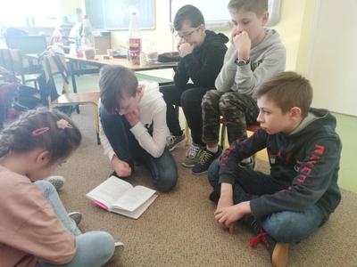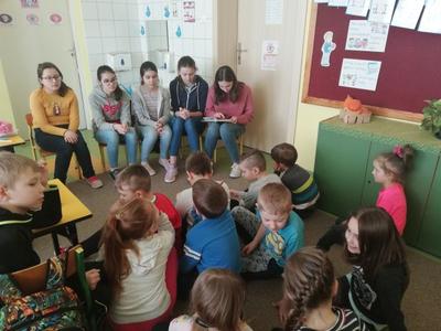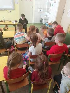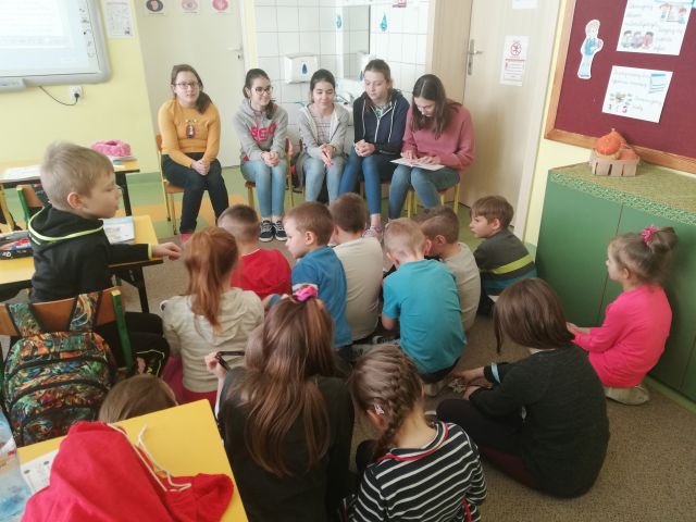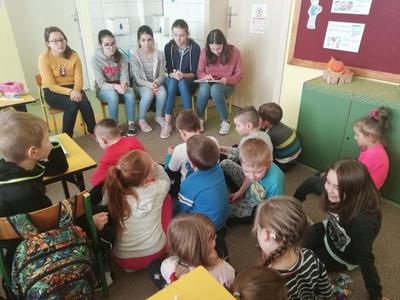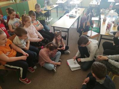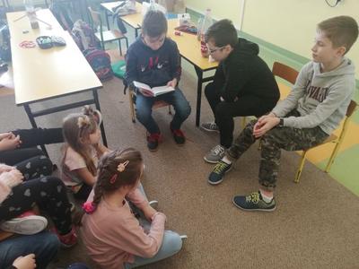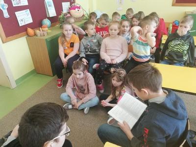 Uczniowie chętnie słuchali starszych kolegów i koleżanek oraz odpowiadali na pytania dotyczące treści słuchanej lektury.