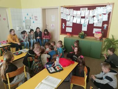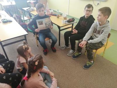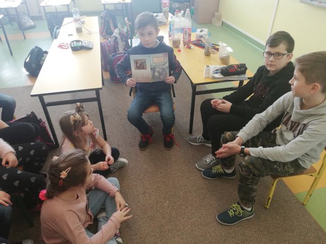W ramach prowadzonych w szkole innowacji czytelniczych („Czytam z klasą, lekturki spod chmurki" oraz „Z polszczyzną za pan brat”) starsi uczniowie czytają młodszym, kolegom i koleżankom z klasy I. Pierwszoklasiści wysłuchali książki pt. „O psie, który jeździł koleją”.