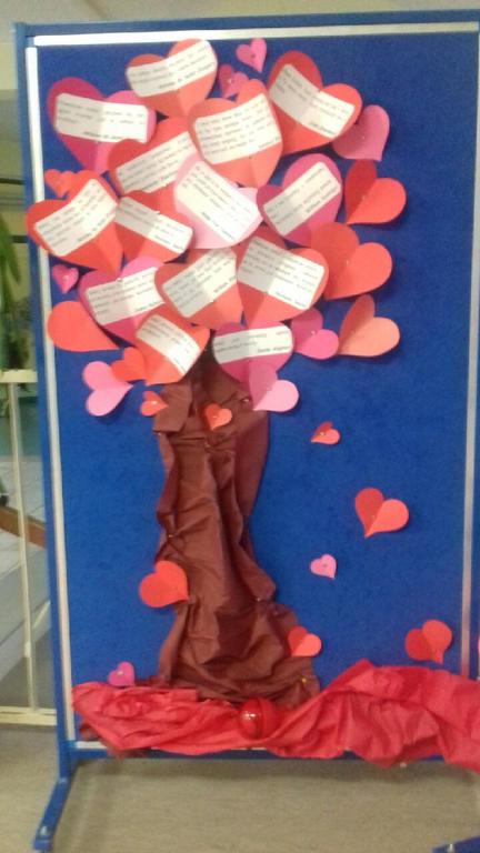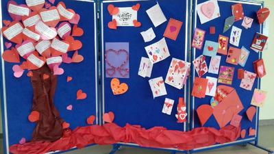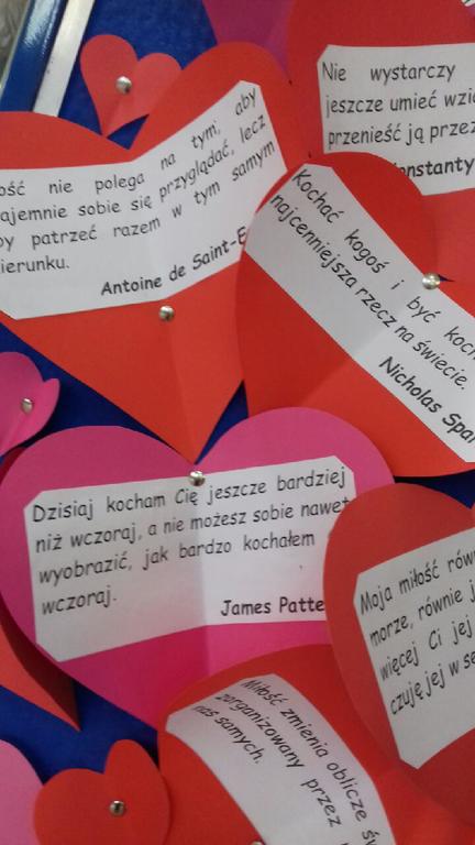 Dnia 14 lutego w Dzień Walentynek w naszej szkole odbyła się wystawa p.t. "Cards full of hearts - Kartki pełne serc". W przedsięwizięcie zaangażowane były wszystkie klasy. Uczniowie wykonali bardzo dużo pięknych kart walentynkowych, które ozdobiły dolny korytarz. Za udział i wkład "serca" dziękuje Pani Ula Łapińska.