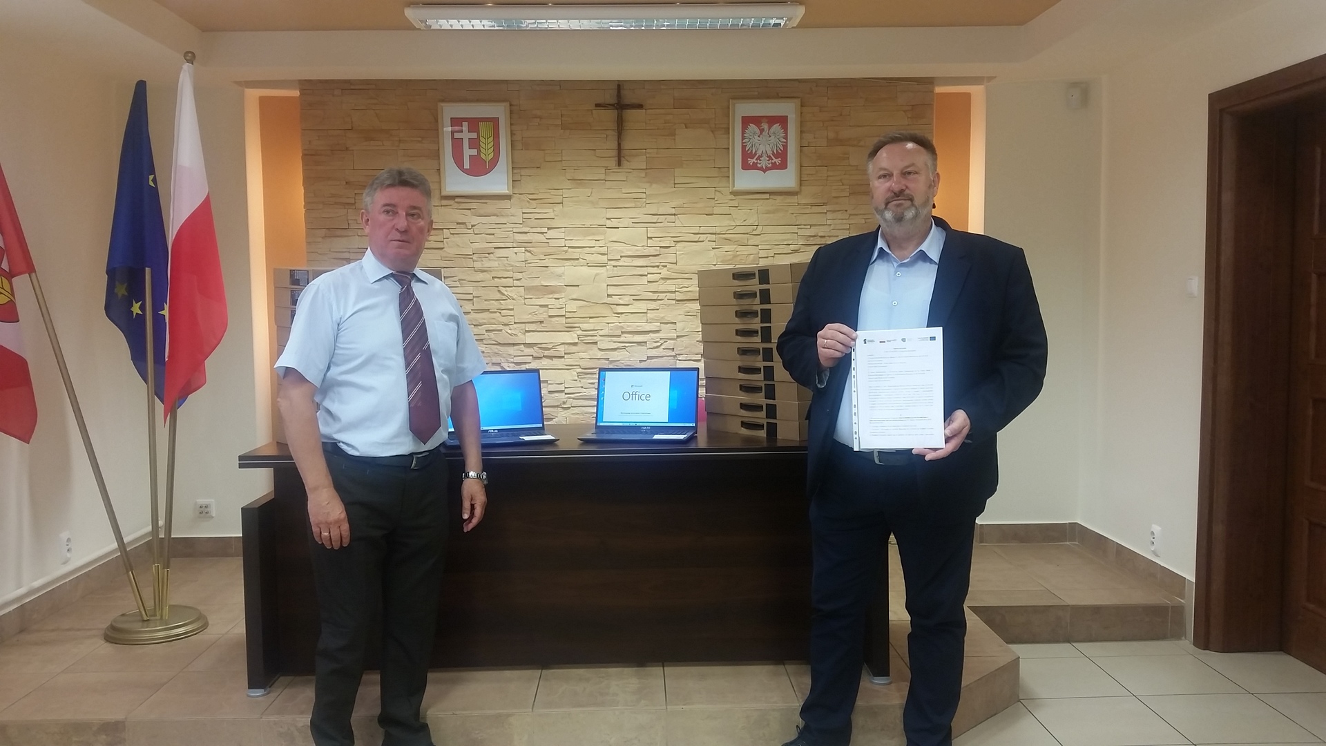 W tym tygodniu nasza szkoła została wyposażona w 18 nowych laptopów zakupionych przez Gminę Kobylin-Borzymy w ramach ogólnopolskiego projektu Zdalna Szkoła Plus o łącznej wartości 53 689,20zł. Oficjalnego przekazania zakupionego sprzętu dokonał Wójt Gminy Kobylin-Borzymy – Pan Dariusz Sikorski. Działanie to zostało w całości sfinansowane ze środków Europejskiego Funduszu Rozwoju Regionalnego w ramach Programu Operacyjnego Polska Cyfrowa na lata 2014-2020. W przypadku kształcenia na odległość laptopy będą umożliwiały uczniom i nauczycielom pracę zdalną, a podczas nauki stacjonarnej będą wykorzystywane jako pomoc dydaktyczna.