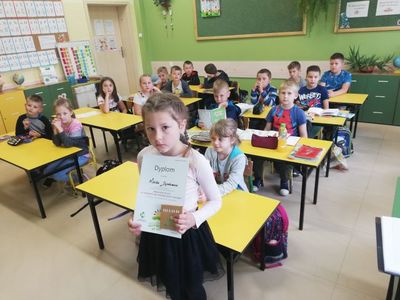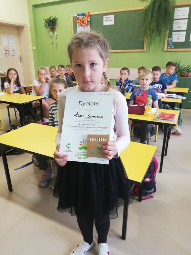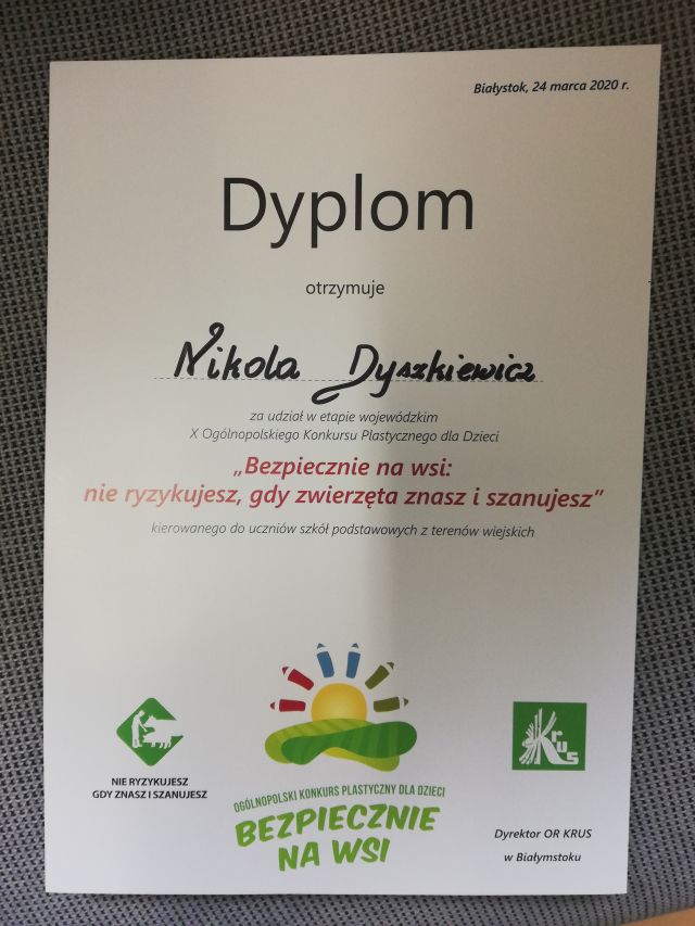 Serdecznie gratulujemy naszej uczennicy Nikoli Dyszkiewicz z kl. II, która otrzymała dyplom i upominek za udział w konkursie pt. „Bezpiecznie na wsi: nie ryzykujesz, gdy zwierzęta znasz i szanujesz”.