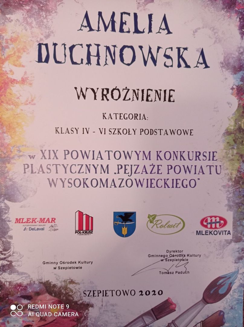 Amelia Duchnowska, uczennica klasy IV, otrzymała WYRÓŻNIENIE w kategorii klasy IV-VI szkoły podstawowe;