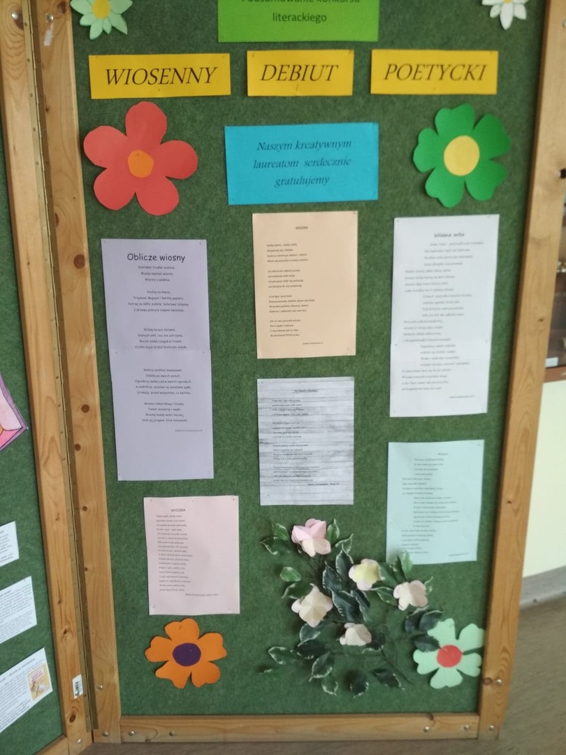 Biblioteka przeprowadziła na przełomie kwietnia i maja 2021r. konkurs literacki pod hasłem ,,Wiosenny debiut poetycki" dla uczniów klas IV-VIII. Uczestnicy konkursu mieli za zadanie napisać wiersz o tematyce wiosennej.