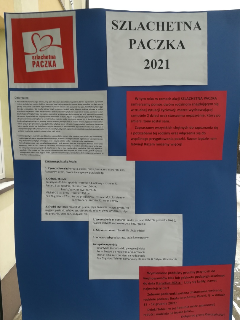 Serdecznie dziękujemy WSZYSTKIM, którzy w tym roku szkolnym pomogli nam w zorganizowaniu akcji Szlachetna Paczka 2021. Dziękujemy za przyniesione produkty żywnościowe, środki czystości, kosmetyki, ubrania, ręczniki, pościel, artykuły gospodarstwa domowego, artykuły szkolne, książki itp. Dziękujemy również wszystkim, którzy wsparli nas finansowo, dzięki czemu mogliśmy kupić tak bardzo potrzebny rodzinom sprzęt AGD. Szczególne podziękowania kierujemy do Rady Rodziców, której zaangażowanie i pomoc w organizację tej szlachetnej akcji przeszła nasze najśmielsze oczekiwania. Wartość szacunkowa całej paczki wyniosła ponad 8800zł.