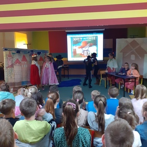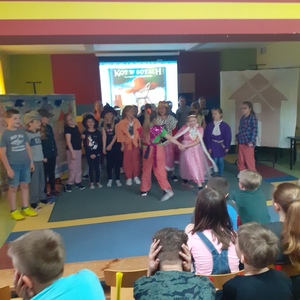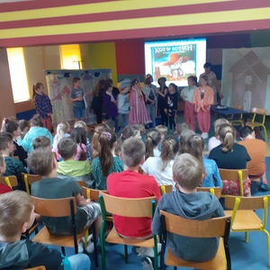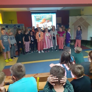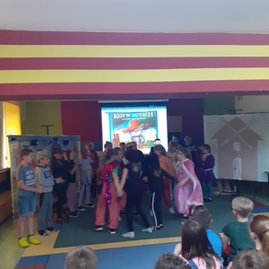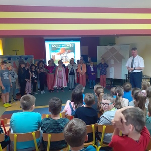 Na widowni zasiadły dzieci z klas pierwszej i trzeciej, ich wychowawczynie oraz Dyrekcja naszej Szkoły. Baśń zakończyła się tym, że księżniczka poślubiła barona Barabana, więc młodzi aktorzy muzycznym akcentem zakończyli swój występ. Zaśpiewali piosenkę o młodych grajkach pt. ,,Muzykalny zastęp”.