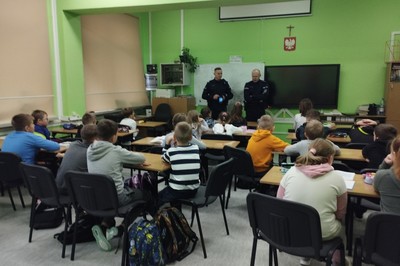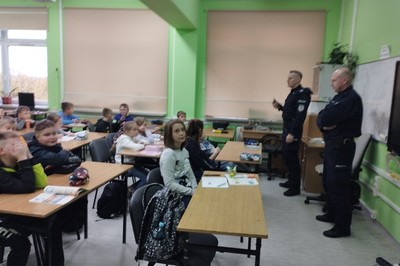W dniu 24 października 2022 r. odbyło się spotkanie uczniów klasy IV naszej szkoły z dzielnicowymi Posterunku Policji w Sokołach. Tematem spotkania była odpowiedzialność prawna małoletnich oraz szeroko rozumiane bezpieczeństwo, ze szczególnym omówieniem bezpieczeństwa w ruchu drogowym. Policjancji apelowali m.in. o ostrożność na drodze i noszenie odblasków.