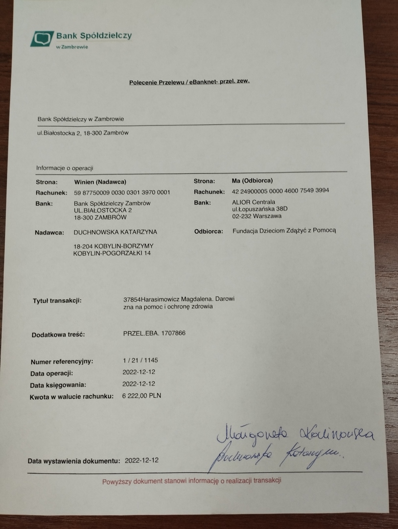 Składamy serdeczne podziękowania Wszystkim, którzy wzięli udział w dwóch kiermaszach ciast zorganizowanych na przełomie listopada i grudnia br. w naszej szkole, na rzecz chorej dziewczynki Madzi Harasimowicz. Dziękujemy zarówno tym, którzy przygotowali wspaniałe domowe wypieki, jak i tym którzy je zakupili. Szczególne podziękowania kierujemy do Rady Rodziców naszej szkoły za wielkie zaangażowanie w organizację obu kiermaszów "od początku do końca" oraz do Samorządu Uczniowskiego za sumienną pracę przy stoisku ze słodkościami. Dochód ze sprzedaży ciast wyniósł 6 222 zł i dokładnie ta kwota zasiliła indywidualne subkonto Madzi założone w Fundacji Dzieciom Zdążyć z Pomocą. Słowa podziękowań pełne wzruszeń i ogromnej wdzięczności przekazujemy również od mamy Madzi - Pani Karoliny Harasimowicz.