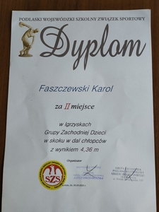 Mamy zaszczyt poinformować, iż uczeń klasy VI naszej szkoły - Karol Faszczewski - zajął II miejsce w półfinale Igrzysk Grupy Zachodniej Dzieci w skoku w dal chłopców organizowanych przez Podlaski Wojewódzki Szkolny Związek Sportowy. Karol uzyskał wysoki wynik 4,36 m.