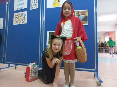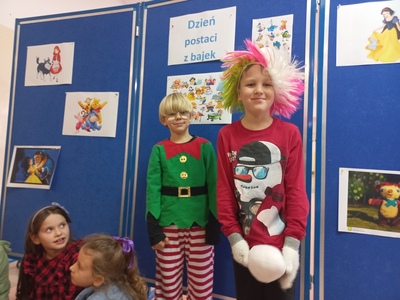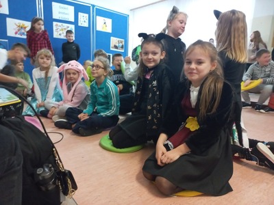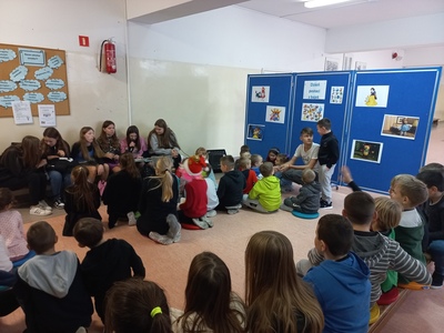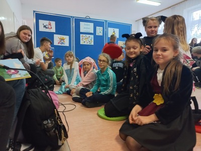 Uczniowie klasy 7 podczas przerw czytali bajki swoim młodszym kolegom.