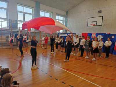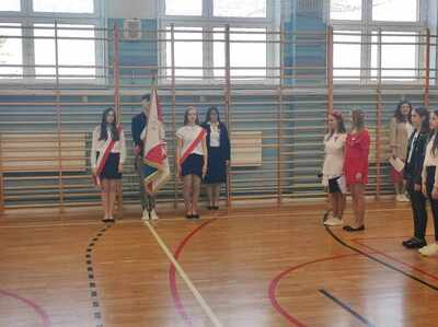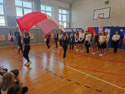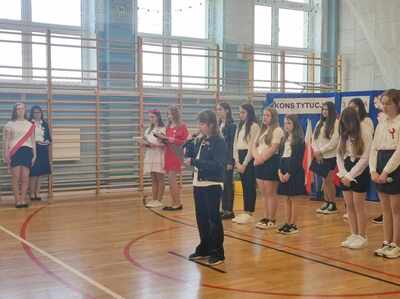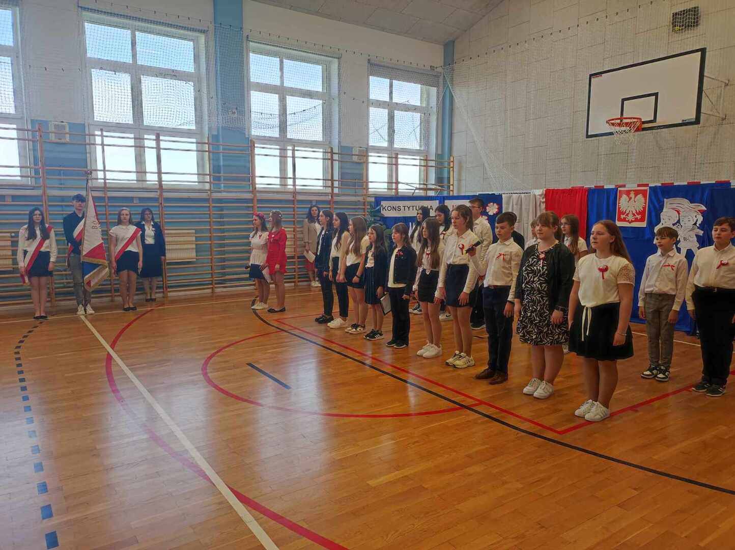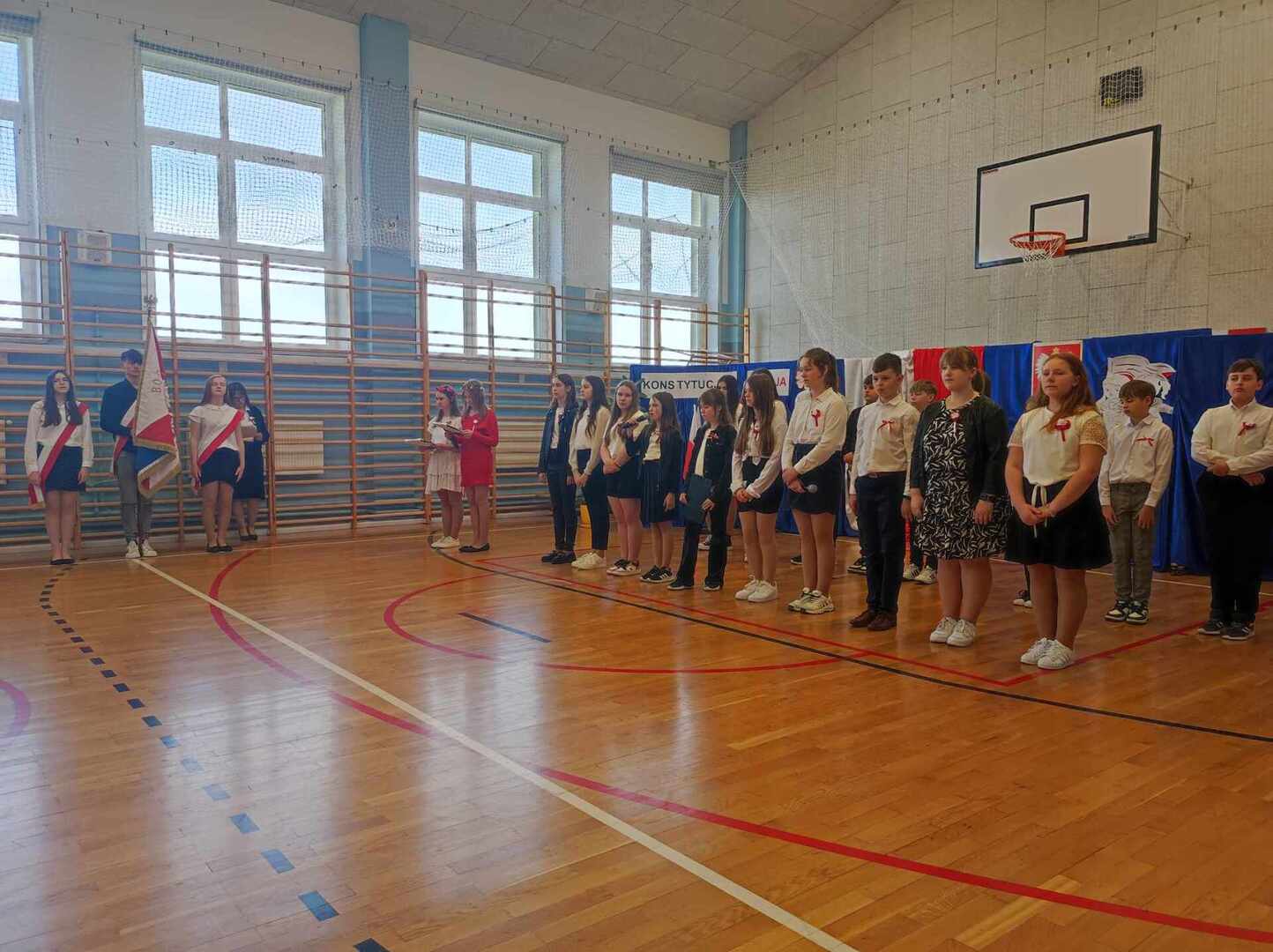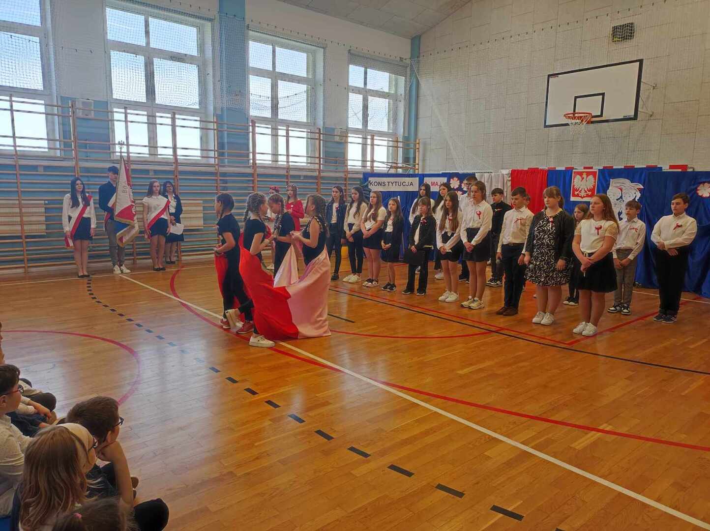 w państwie. Jak zawsze symbolem obchodów najstarszego narodowego święta były barwy narodowe: biały i czerwony oraz hymn państwowy, którego wszystkie cztery zwrotki odśpiewano na początku uroczystości. Następnie narratorki: Alicja Kulikowska i Emilia Trzcianko, sprawnie przeniosły słuchaczy w odległy 1791 rok. Zgromadzeni uczniowie z niezwykłą uwagą podziwiali wiersze, piosenki oraz taniec z flagą.