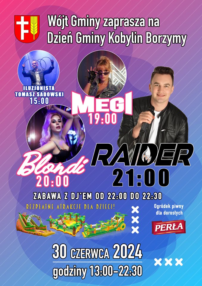 Wójt Gminy Kobylin-Borzymy serdecznie zaprasza na festyn środowiskowy, który odbędzie się 30 czerwca br. na placu przy Urzędzie Gminy w godzinach 13.00 - 22.30