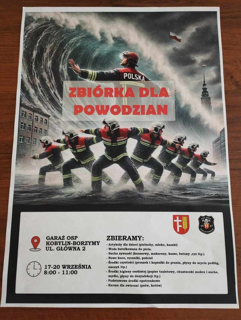 Nasza szkoła przyłącza się do akcji Ochotniczej Straży Pożarnej w Kobylinie-Borzymach, polegającej na zbiórce podstawowych produktów pierwszej potrzeby dla dotkliwie dotkniętych skutkami powodzi mieszkańców naszego kraju. Zbierane będą m.in.: artykuły dla dzieci, woda butelkowana do picia, sucha żywność, środki czystości, środki opatrunkowe, pościel, ręczniki, koce, karma dla zwierząt itp. (szczegóły na załączonym plakacie). Wymienione produkty należy dostarczyć do garażu OSP znajdującego się przy ul. Głównej 2, w dniach 17-20 września w godz. 8.00 - 11.00. Zachęcamy wszystkich do wsparcia zbiórki, liczy się każdy, nawet najmniejszy gest!