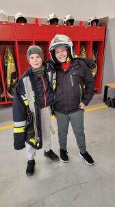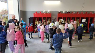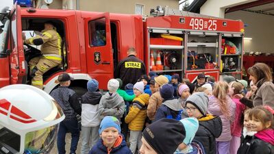 Następnie dzieci obejrzały samochód strażacki, a nawet weszły do środka, przymierzyły także mundury naszych bohaterów, co dało im wiele radości.