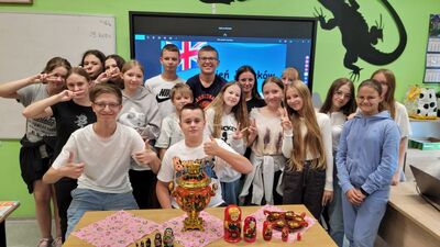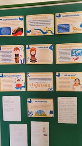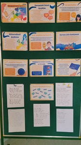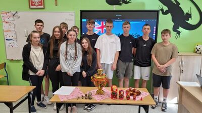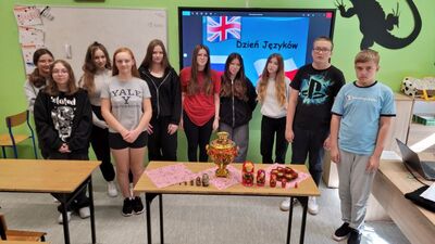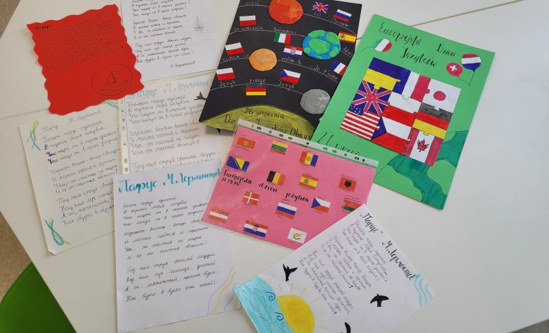 Na języku rosyjskim uczniowie klas VII i VIII bliżej zapoznali się z kulturą Federacji Rosyjskiej. Obejrzeli film i dowiedzieli się o historii samowara, matrioszki oraz naczyń ręcznie zdobionych. Ponadto wykonali plakaty promujące naukę języków obcych, a najstarsi wzięli udział w konkursie kaligraficznym i przepisali ręcznie wiersz w języku rosyjskim.