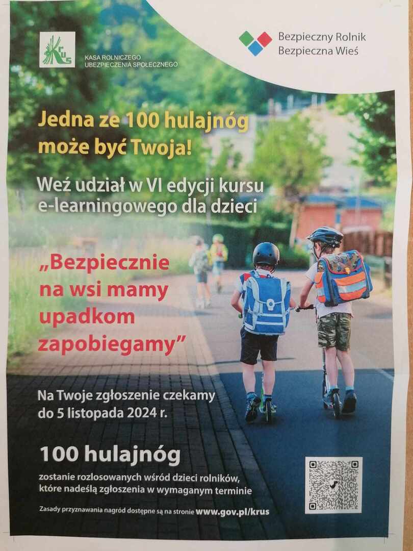Osoby, które odbędą kurs i prześlą do Centrali KRUS certyfikat potwierdzający jego ukończenie wraz z formularzem zgłoszeniowym, wezmą udział w losowaniu nagrody – hulajnogi.