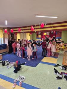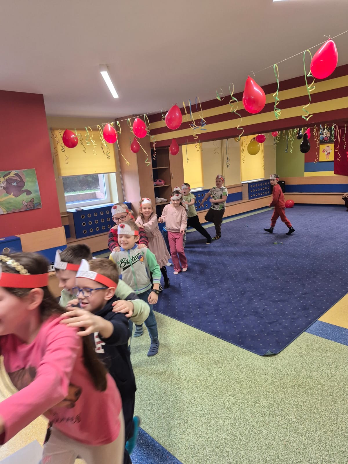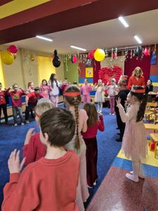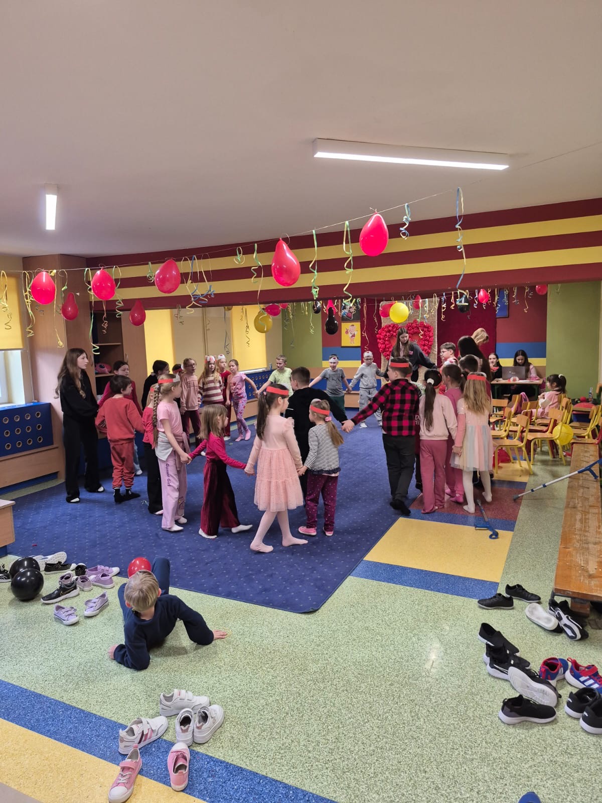 Tego dnia w szkolnej świetlicy odbył się bal walentynkowy, w którym uczestniczyli uczniowie klas I - III oraz dzieci z oddziałów przedszkolnych. W świątecznie udekorowanej sali walentynkowe animatorki zabaw (w tej roli świetnie sprawdziły się uczennice Samorządu Szkolnego z klasy VIII - Amelka Duchnowska, Amelka Kalinowska, Olga Kropiewnicka i Weronika Stypułkowska) dbały o dobry nastrój i doskonałą zabawę. Zachęcały młodsze koleżanki i kolegów do wspólnej zabawy, tańców i konkursów, za które uczestnicy otrzymali słodkie upominki w kształcie czerwonych serduszek. Panowała radosna, serdeczna i przyjazna atmosfera. Święto to pozwoliło dzieciom lepiej zintegrować się, wyrazić swoje emocje, takie jak empatia, sympatia i szacunek dla innych.