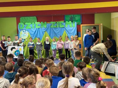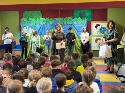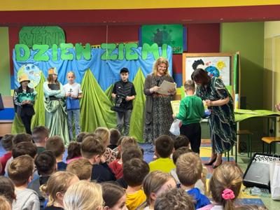 Następnie uczniowie klasy V przedstawili krótką inscenizację. Główna bohaterka tego programu Pani Ziemia zwróciła uwagę jak drobne zaniedbania mogą prowadzić do bardzo poważnych, ekologicznych problemów i że każdy z nas w życiu codziennym ma możliwość wprowadzenia małych zmian, które przyczynią się do poprawy stanu środowiska.