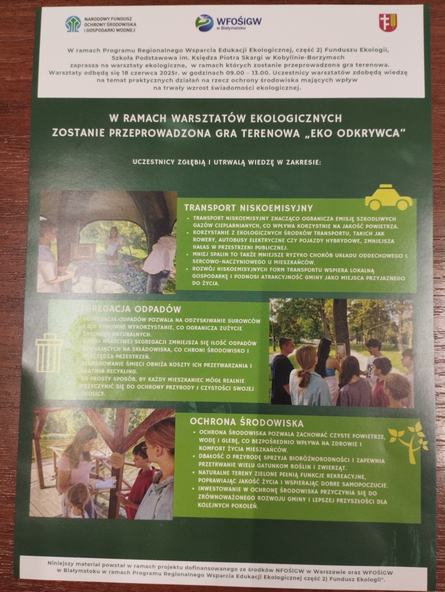 W dniu 18 czerwca 2025 r. w godzinach 9.00-13.00 w Szkole Podstawowej im. Księdza Piotra Skargi w Kobylinie-Borzymach odbędą się warsztaty ekologiczne dla uczniów klas I-VIII. Jest to forma realizacji projektu dofinansowanego ze środków Narodowego Funduszu Ochrony Środowiska i Gospodarki Wodnej w Białymstoku w ramach Programu Regionalnego Wsparcia Edukacji Ekologicznej, Część 2) Fundusz Ekologii.