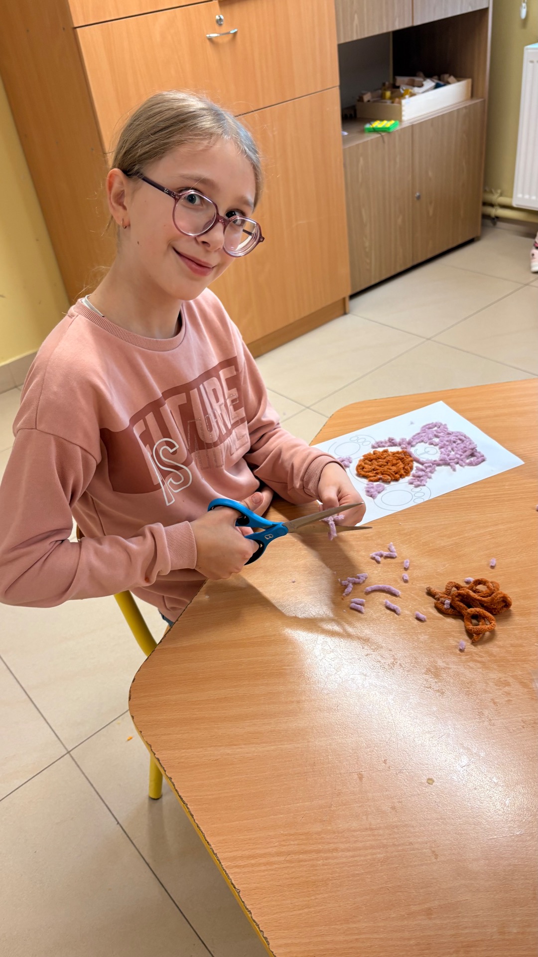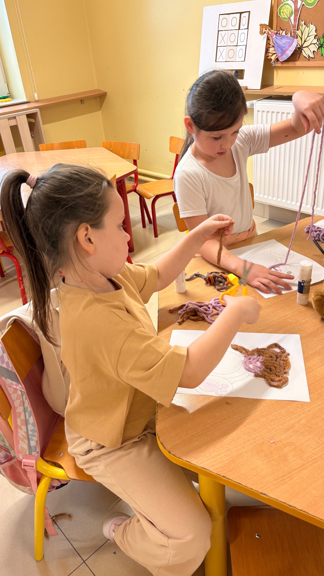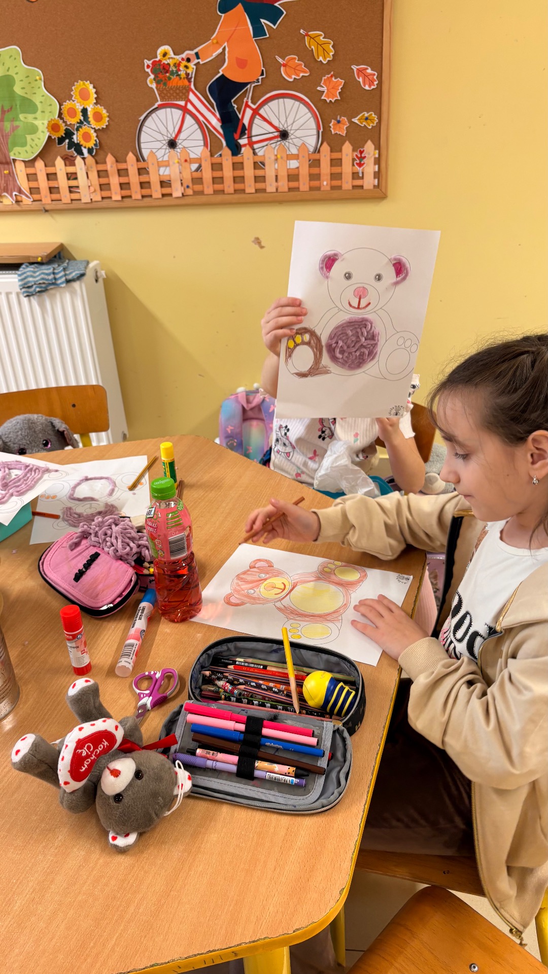 Podczas zajęć plastycznych na świetlicy dzieci wyklejały misie włóczką i powstały ciekawe projekty.