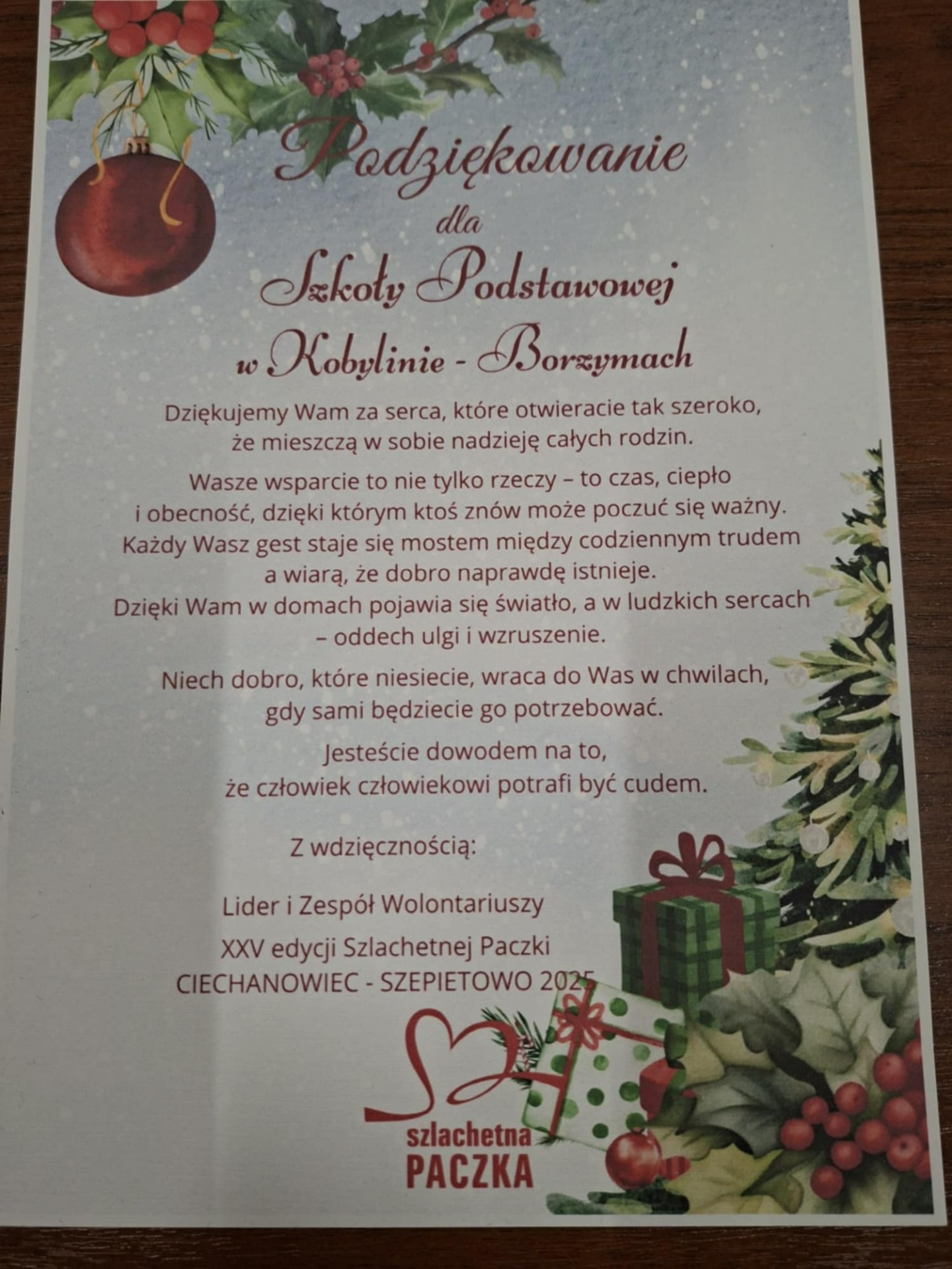 Tymi słowami podziękowano naszej szkole za udział w akcji Szlachetna Paczka i tymi słowami dziękujemy WSZYSTKIM, którzy w tym roku wsparli przygotowanie paczki wybranej przez nas Rodzinie. Dziękujemy za przyniesione produkty żywnościowe, środki czystości, kosmetyki, ubrania, artykuły gospodarstwa domowego itp. Dziękujemy za wszystkie karty podarunkowe! Dziękujemy również wszystkim, którzy wsparli nas finansowo, dzięki czemu można było kupić wszystko, czego rodzina najbardziej potrzebuje. Dziękujemy Radzie Rodziców i Kołom Gospodyń Wiejskich "Garbowianki", "Piszczatowianki" i "Kobylińskie Maczki" za zorganizowanie kiermaszu ciast i przeznaczenie ponad 7 tysięcy na pomoc wybranej rodzinie. Wartość szacunkowa całej naszej paczki wyniosła w tym roku ponad 11 000 zł.
