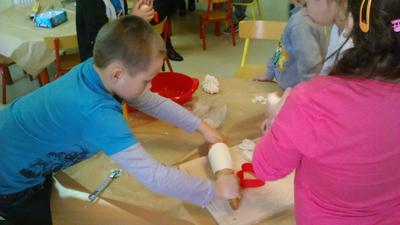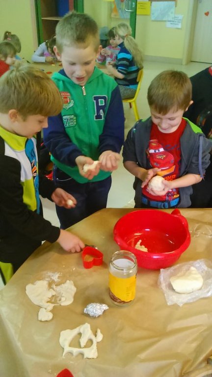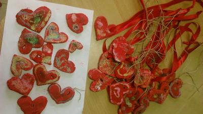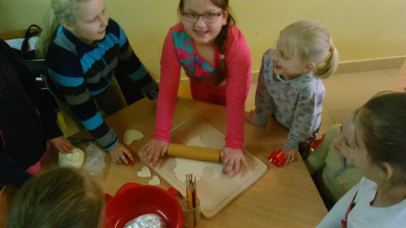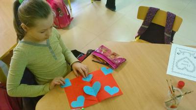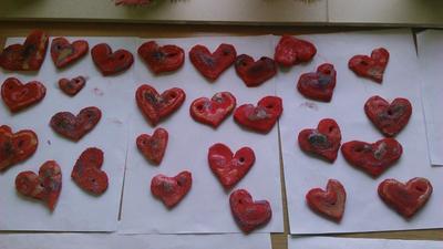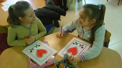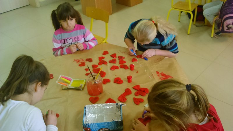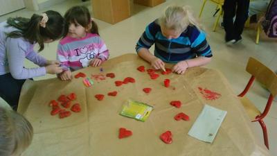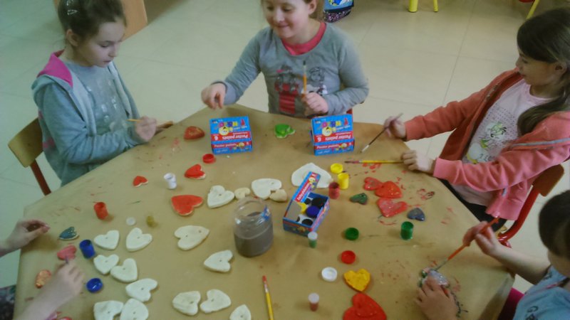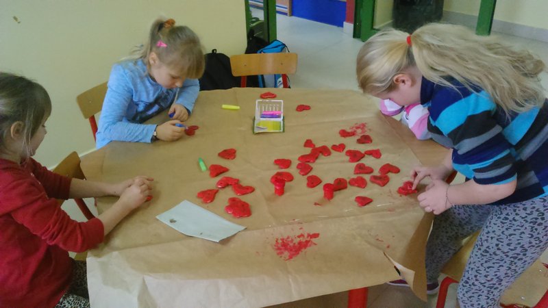 Tydzień przed Walentynkami w naszej świetlicy było wesoło i zabawnie. Redagowaliśmy życzenia i wiersze walentynkowe, które później zapisywaliśmy na własnoręcznie przygotowanych kartkach. Bliskie naszemu sercu osoby otrzymały upominki dzięki działającej w szkole poczcie walentynkowej. Punktem kulminacyjnym była wspólna praca, która polegała na stworzeniu z masy