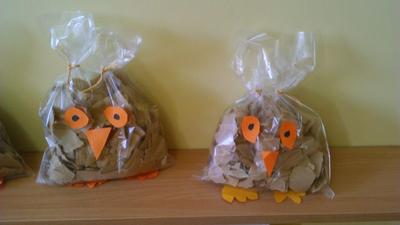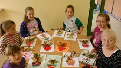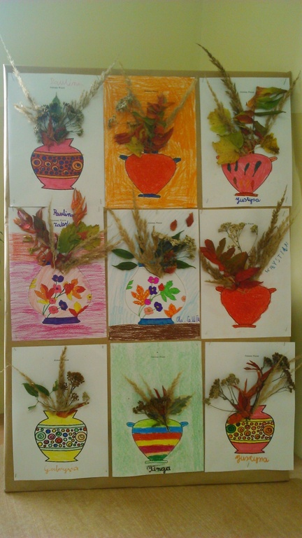 Młodzi projektanci wykonali piękne wazony, w których znalazły się liście Pani Jesieni.
