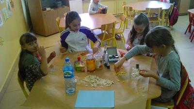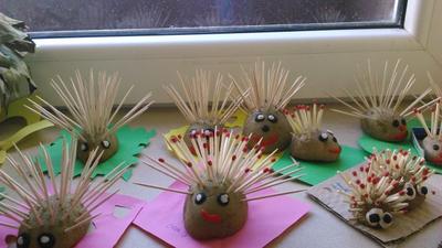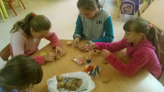 Uczniowie wykonywali jesienne jeże z ziemniaków oraz  wielobarwne drzewa z pestek dyni.