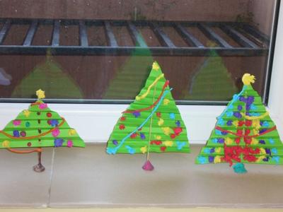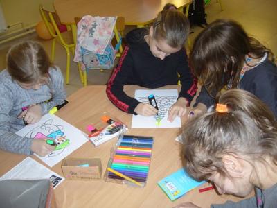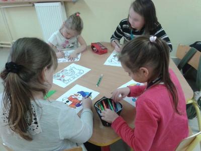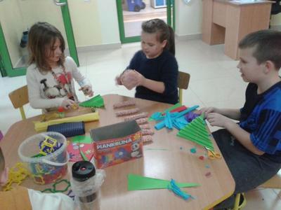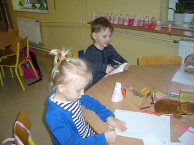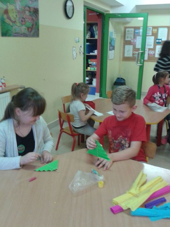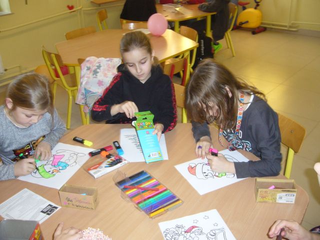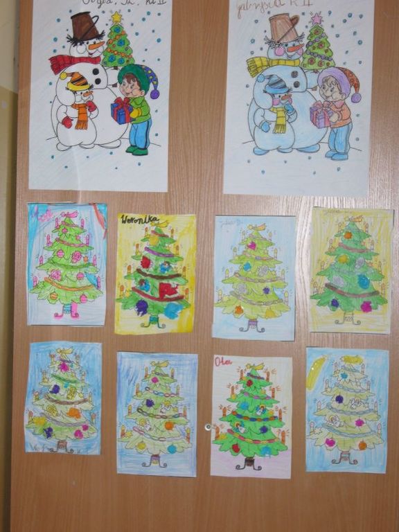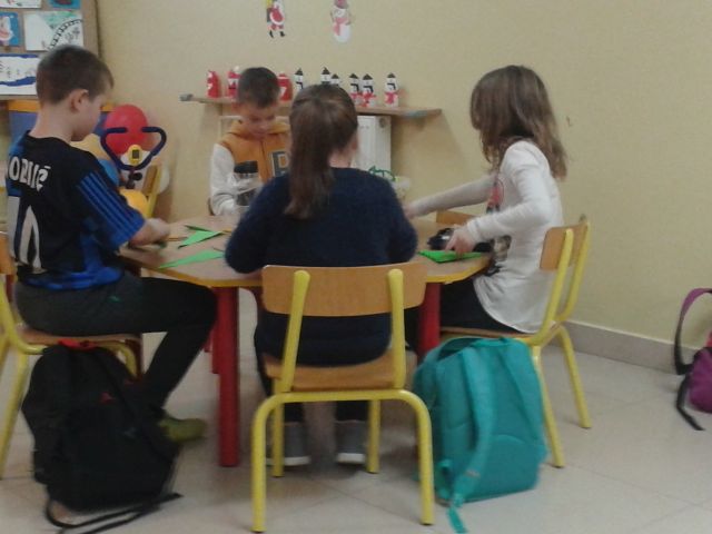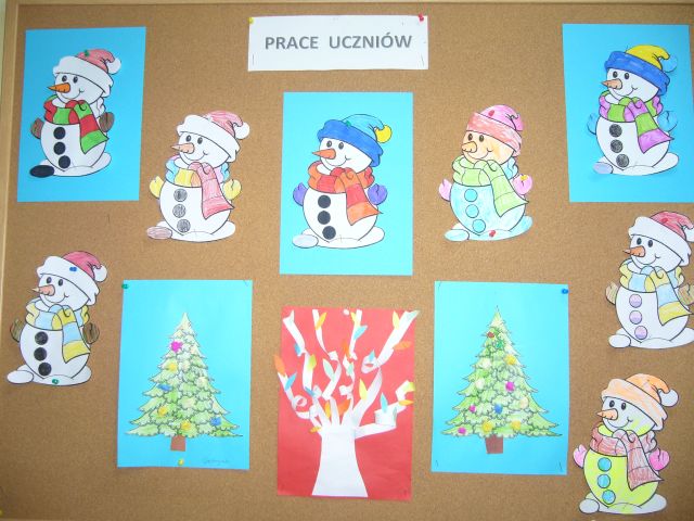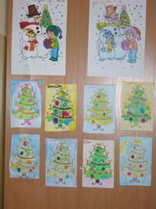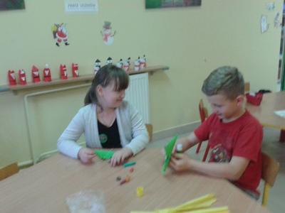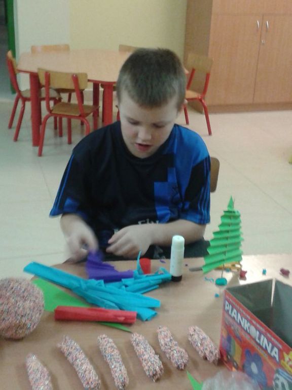 Gdy za oknem pojawił się pierwszy śnieg Świetliki od razu nabrały ochoty na zimowe i bożonarodzeniowe dekoracje. Starsze dzieci zrobiły drzewko obsypane płatkami śniegu, bałwanki, mikołaje, choinki, aniołki, renifery, kartki świąteczne oraz ozdoby choinkowe, czyli bombki i łańcuchy. Młodsze wykonały prace plastyczne i kolorowanki tematycznie związane z zimą i świętami. Wszystkie prace wykorzystaliśmy do dekoracji sal, co umiliło nam pobyt w świetlicy i przybliżyło atmosferę Świąt Bożego Narodzenia.