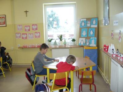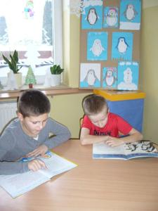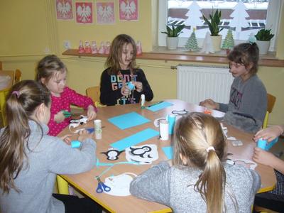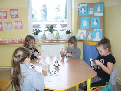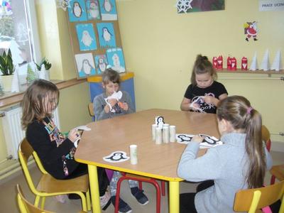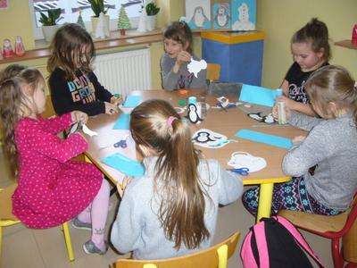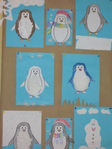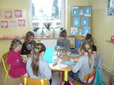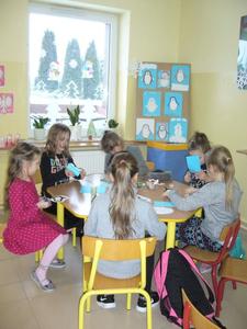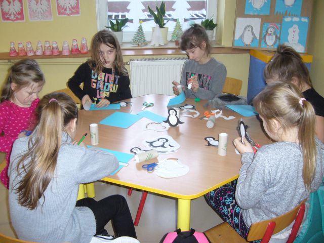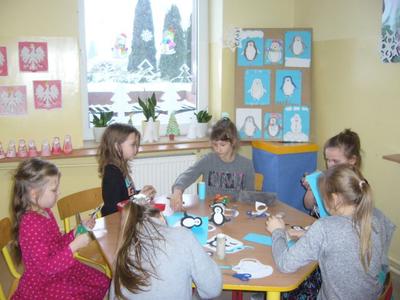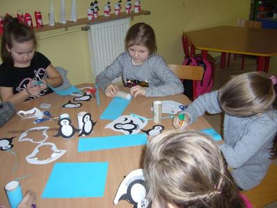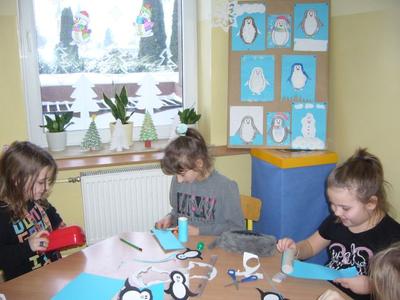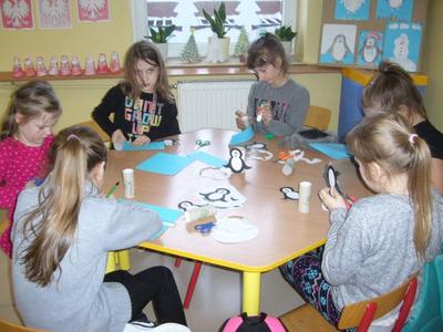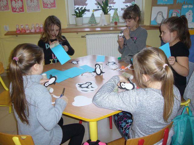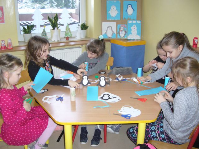 Styczeń – to czas, kiedy zima daje o sobie mocno znać. Właśnie taki okres był okazją do zapoznania Świetlików z życiem pingwinów. W oparciu o cykl bajek „Pingwini z Madagaskaru” oraz książkę "Zaczarowana zagroda" A. i Cz. Centkiewiczów, uczniowie dowiedzieli się, jak toczy się życie na Madagaskarze – krainie wiecznego lodu. Poznali charakterystyczne cechy wyglądu pingwinów i ich zwyczaje życia codziennego. Różnymi technikami wykonywali prace plastyczne - z pingwinem w roli głównej. W ten sposób przybliżyli sobie postać jednego ze zwierząt polarnych. A świetlica wzbogaciła się o kolejne prace, które posłużyły do dekoracji sali.