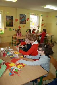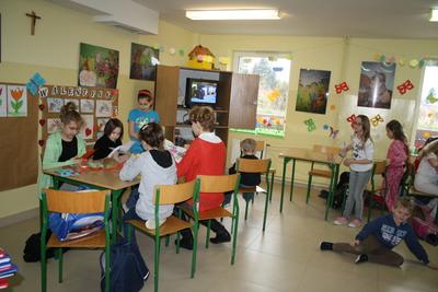 Do świetlicy zawitała Pani Wiosna. Wraz z nią przybyły kolorowe kwiaty, wielobarwne motyle – zwiastuny zmian nadchodzących w przyrodzie. Powstał także wizerunek samej Pani Wiosny w pięknej sukni z kwiatów. Wszystkie dzieci powitały „wiosenne” pomysły z radością i wykonały przepiękne prace plastyczne. Niektórzy skupili się na budowaniu wiosennych stadionów :)