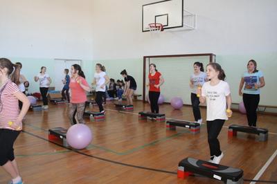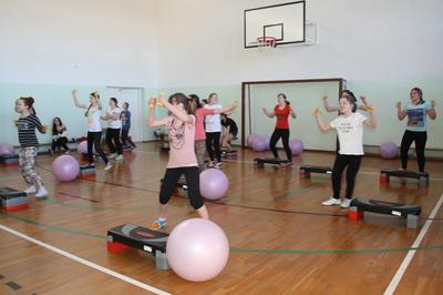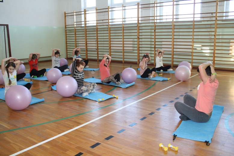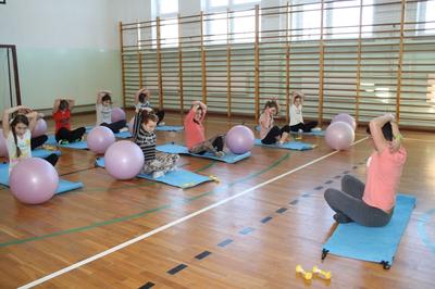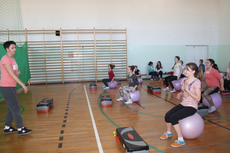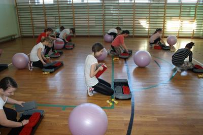 Uczennice z klas I gimnazjum uczęszczają na zajęcia z aerobiku. W tym celu zakupiliśśmy sprzęt, który podnosi atrakcyjność zajęć. Rekwizyty nizbędne do realizacji zajęć to : stepy, piłki gimnastyczne, karimaty i ciężarki.