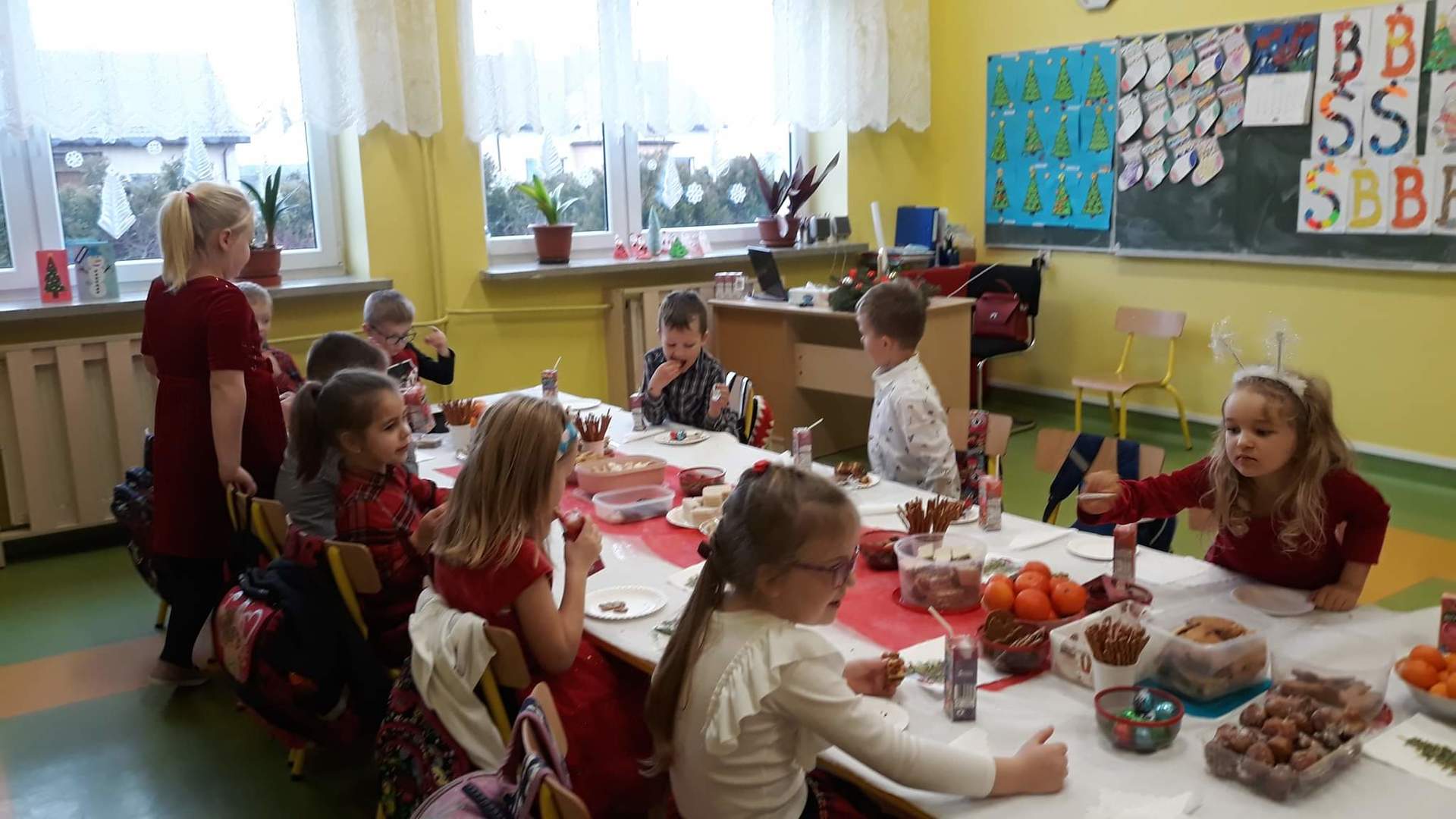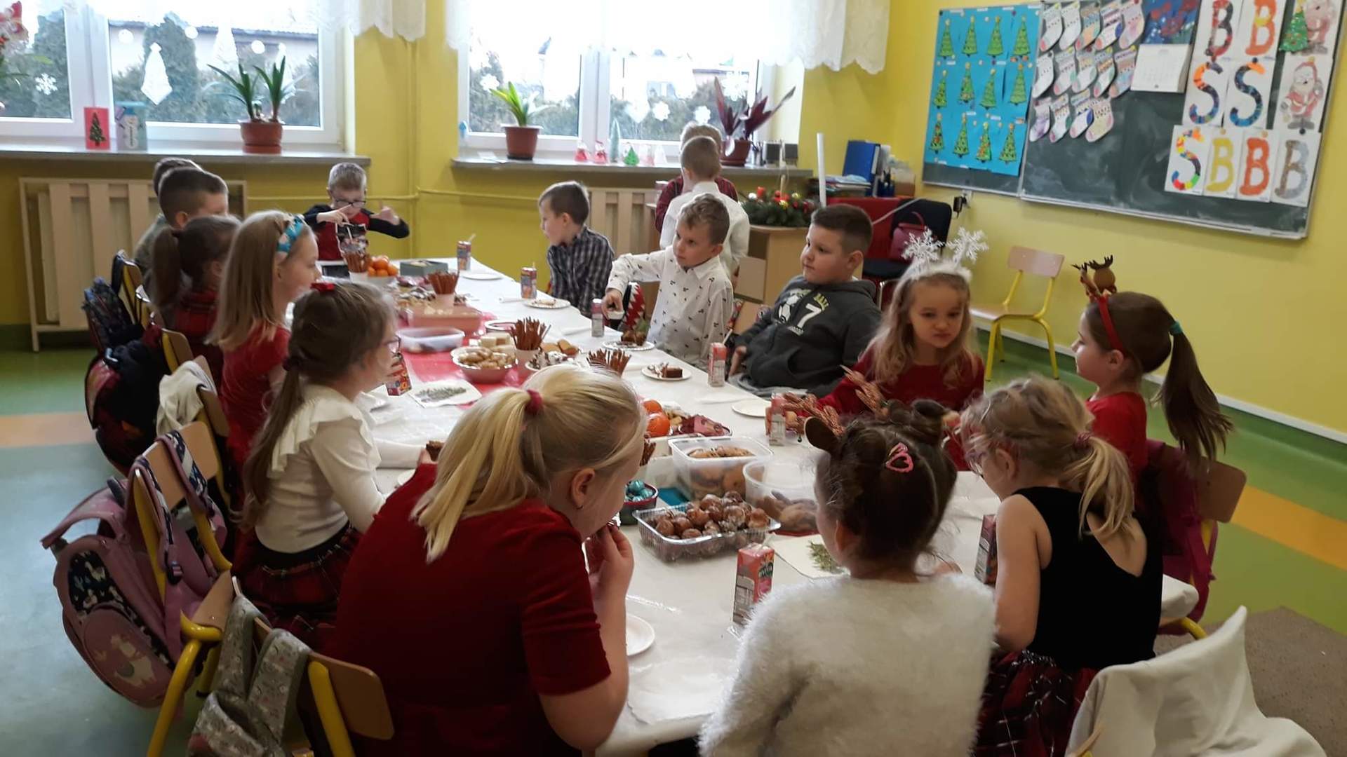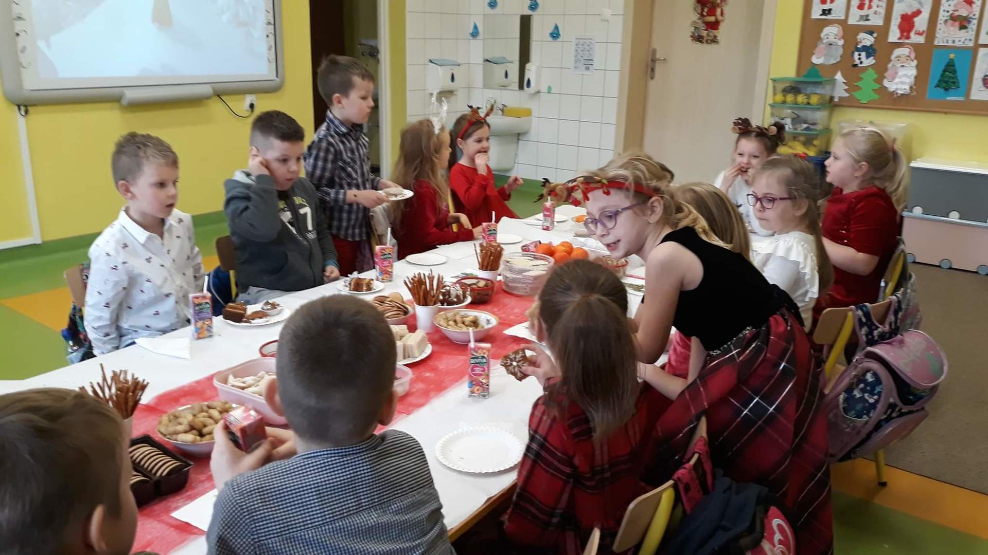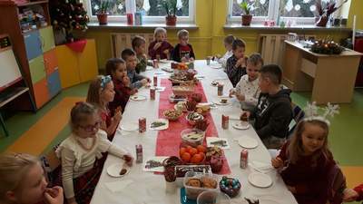 W piątek17 grudnia 2021r. w zerówce odbyła się uroczysta wigilia. Dzieci zasiadły do pięknie nakrytego stołu, na którym znajdowały się przez nich przyniesione potrawy. Była też wspaniała chwila składania życzeń, dzielenia się opłatkiem, śpiewania kolęd i pastorałek. Dzieci potrafiły stworzyć niepowtarzalnie serdeczną atmosferę, utrwalając polską tradycję świąteczną.