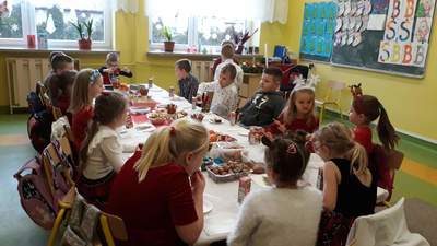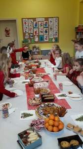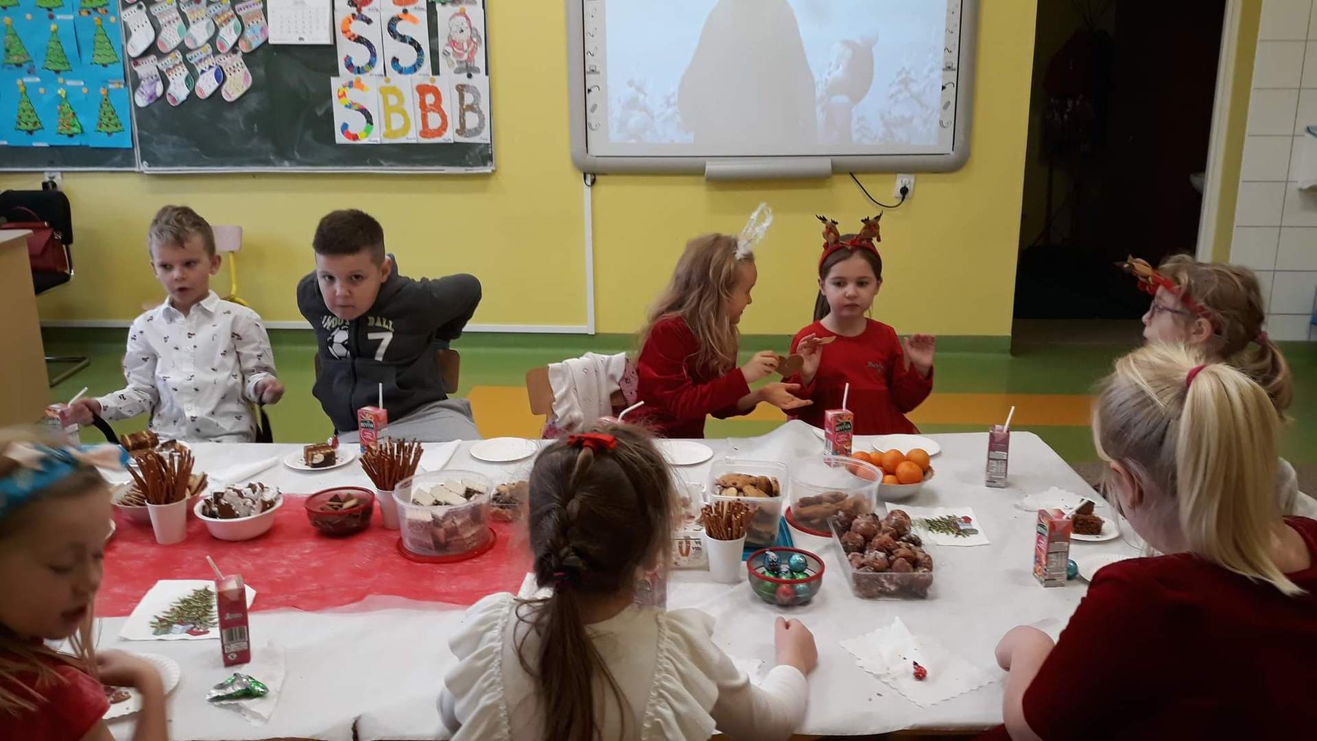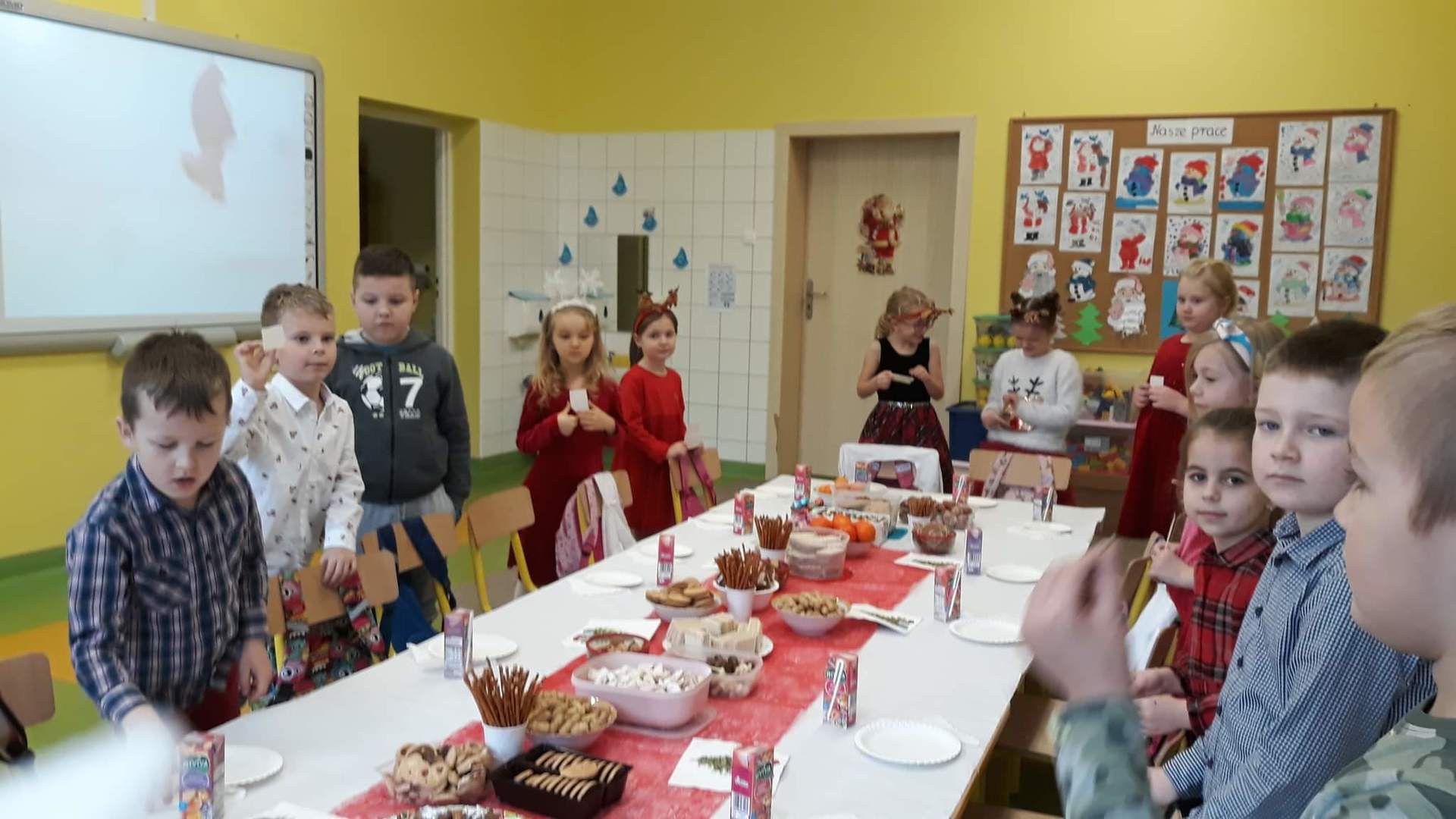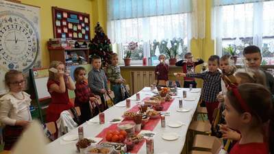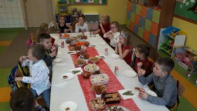 W piątek17 grudnia 2021r. w zerówce odbyła się uroczysta wigilia. Dzieci zasiadły do pięknie nakrytego stołu, na którym znajdowały się przez nich przyniesione potrawy. Była też wspaniała chwila składania życzeń, dzielenia się opłatkiem, śpiewania kolęd i pastorałek. Dzieci potrafiły stworzyć niepowtarzalnie serdeczną atmosferę, utrwalając polską tradycję świąteczną.