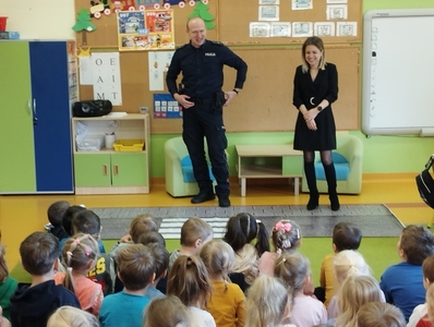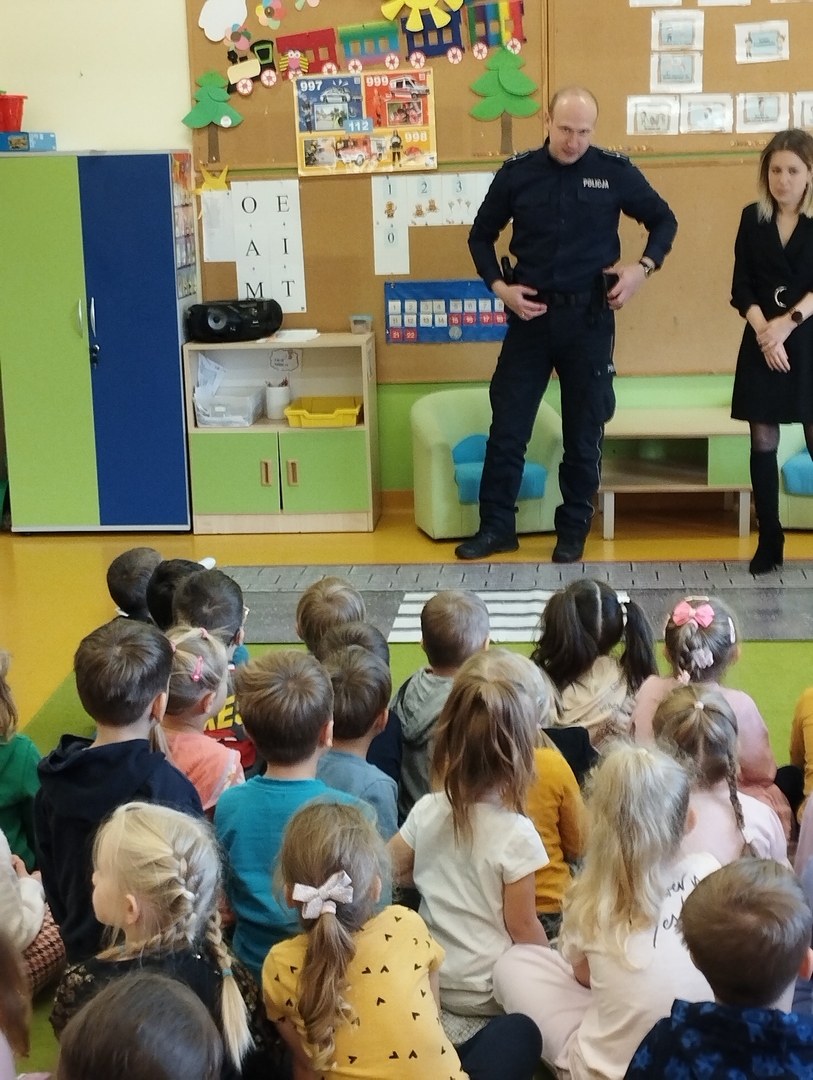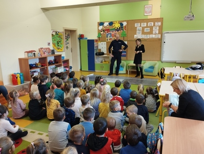 W dniu 17 listopada br. odbyło się spotkanie dzieci ze wszystkich grup przedszkolnych z funkcjonariuszami Policji. Podczas spotkania dzieci poznały główne zadania oraz elementy wyposażenia policjanta, a także podstawowe zasady bezpieczeństwa w ruchu drogowym. Omówione zostały również obowiązujące w Polsce numery alarmowe i sytuacje, w których należy z nich korzystać.