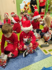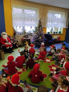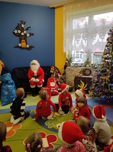 Mikołaj obdarował wszystkie dzieci prezentami. Dzieci wizytą Gościa były bardzo przejęte, sprawił im dużo radości :)
