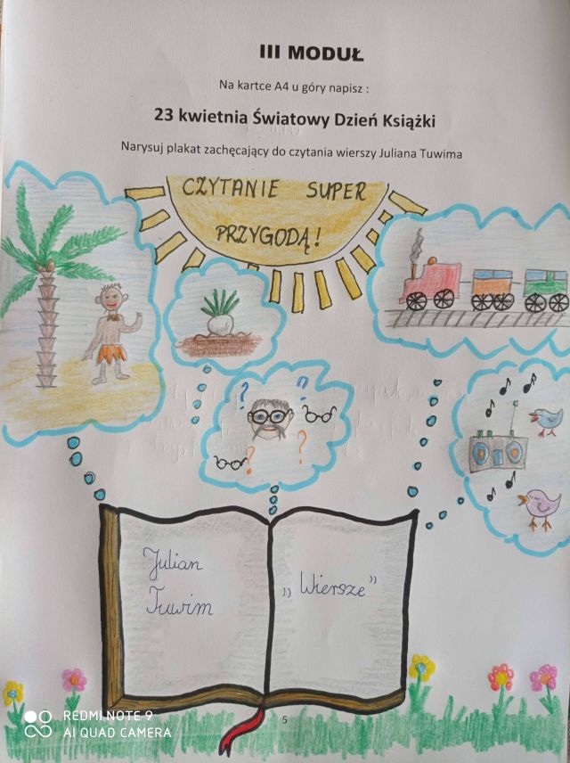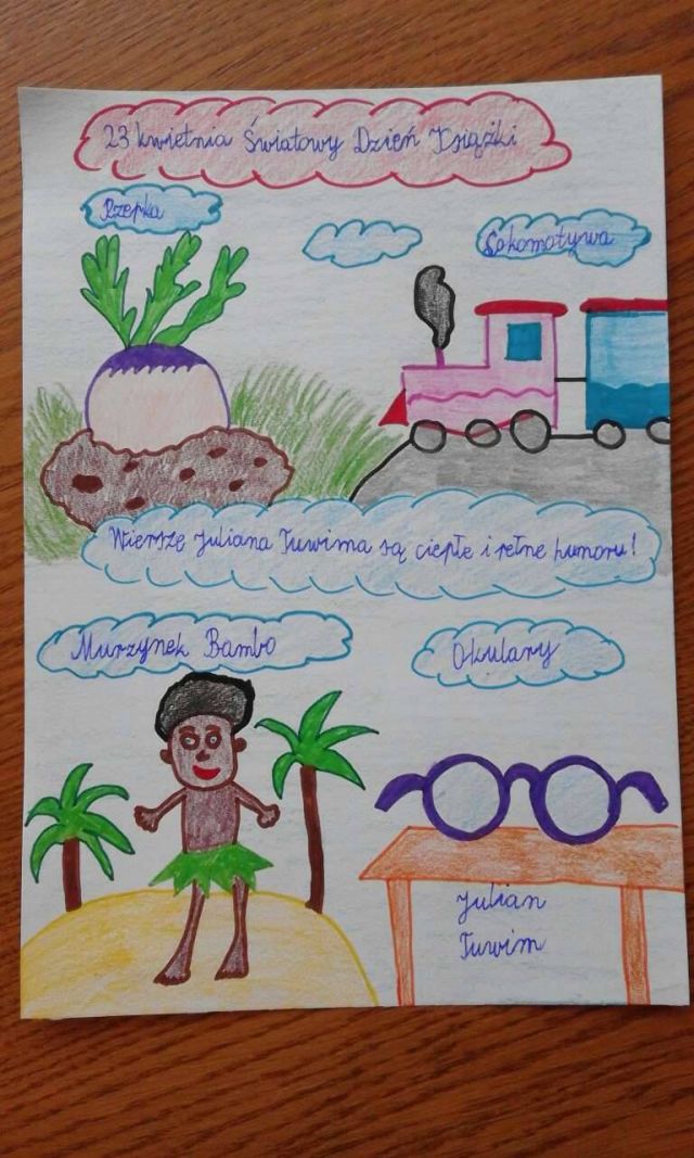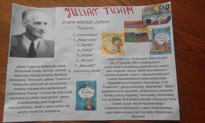 W ostatnim module poznaliśmy twórczość i życiorys J. Brzechwy (klasy I, II) oraz J. Tuwima (klasa III). Dzieci czytały i recytowały wiersze. Spośród przeczytanych wierszy wybrały ten, który najbardziej im się spodobał. Wykonały portret autora, sylwetę głównego bohatera, plakaty i ilustracje do wierszy. Zaprojektowały stroje i wzięły udział w bajkowym pokazie mody.