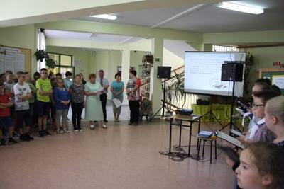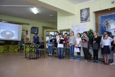 Uroczysty apel odbył się na korytarzu szkolnym przy gablotach poświeconych patronowi. Wzięli w nim udział dyrekcja, nauczyciele, rodzice i uczniowie.