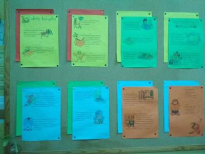 - wystawki książek w klasach w czasie realizacji projektów: Juliana Tuwima, Jana Brzechwy, Widmarka i Willis, Ignacego Krasickiego, Małgorzaty Musierowicz,  Kornela Makuszyńskiego, Adama Mickiewicza,  Henryka Sienkiewicza, Ewy Nowak.