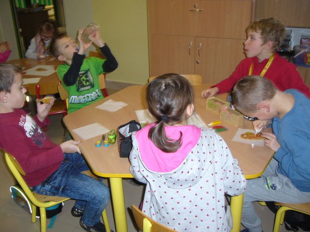 W oczekiwaniu na Święta Bożego Narodzenia Świetliki pod okiem wychowawców dekorowały pierniki. Pierniczki miały kształt mikołajów, żeby nawiązać do tradycji Św. Mikołaja. A pomysłów na dekorację było tyle, ile wychowanków. Każdy chciał zrobić to według własnej koncepcji. Sprawiło im to wiele radości, a jednocześnie było to bardzo przyjemne zajęcie kulinarne. Zapach pierników skusił nawet panią Dyrektor, która zawitała w nasze skromne progi. Zajęcia zakończyły się degustacją własnoręcznie ozdobionych pierników.