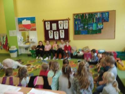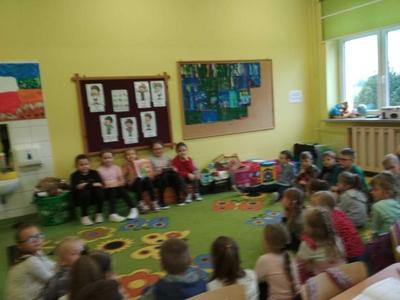W oddziale przedszkolnym uczniowie klasy II zaprezentowali repertuar ,,Głośnego czytania" pod tytułem ,, Zanurzamy się w jesieni" . Dzieci czytały opowiadania powiązane z odgadywaniem ilustracji ,,Jesienna kura", recytowały wiersze. Odgadywały z książki  ,,Zagadki dla maluchów" Anny Mikita o tematyce jesiennej.